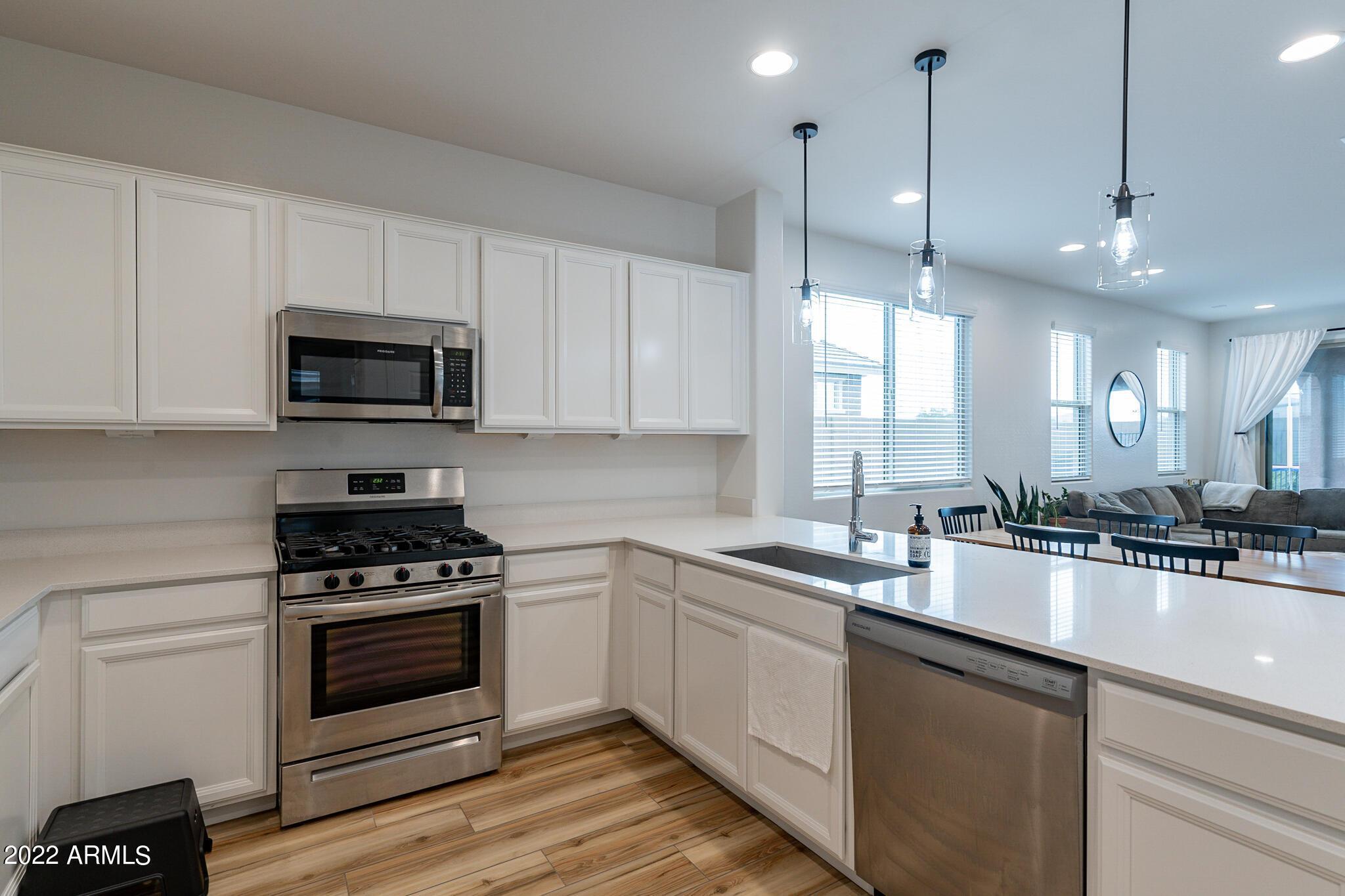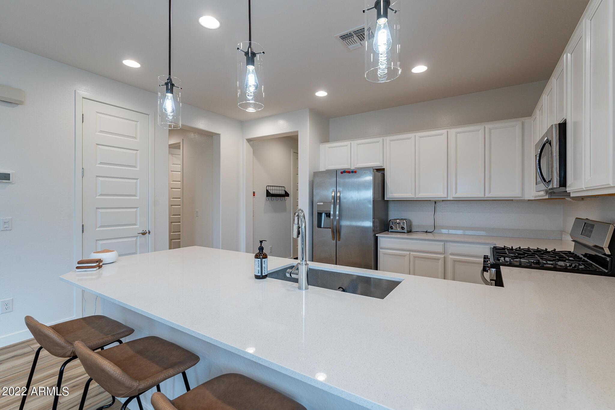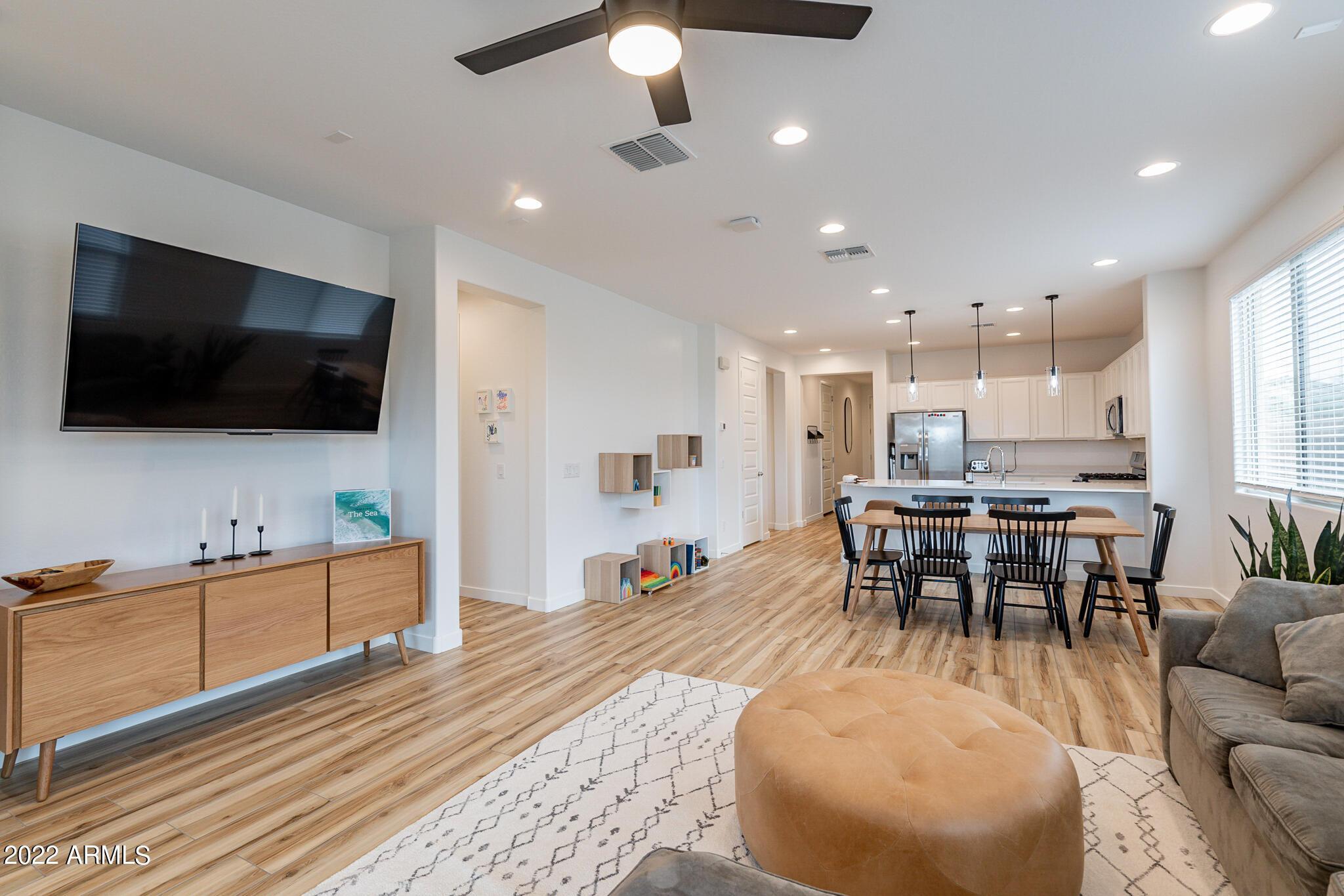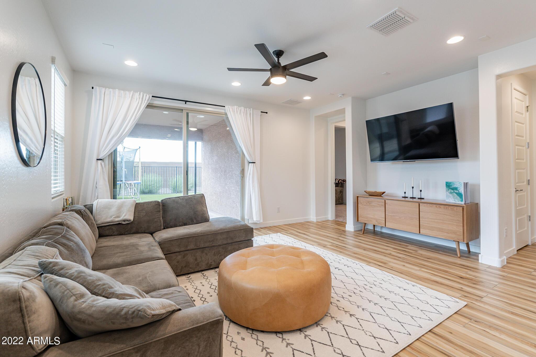 Very close to Queen Creek Marketplace Shopping Center, this 5 bedroom 3 bathroom, 1,970 sq. ft. home still looks brand new (built in 2021). Featuring a great room concept and a beautiful kitchen with Quartz counters, there is also upgraded tile in all the main living areas and some of the bedrooms, artificial turf in the backyard, and sunscreens on the west and south side of the house. The tankless hot water upgrade also saves on both energy and space.