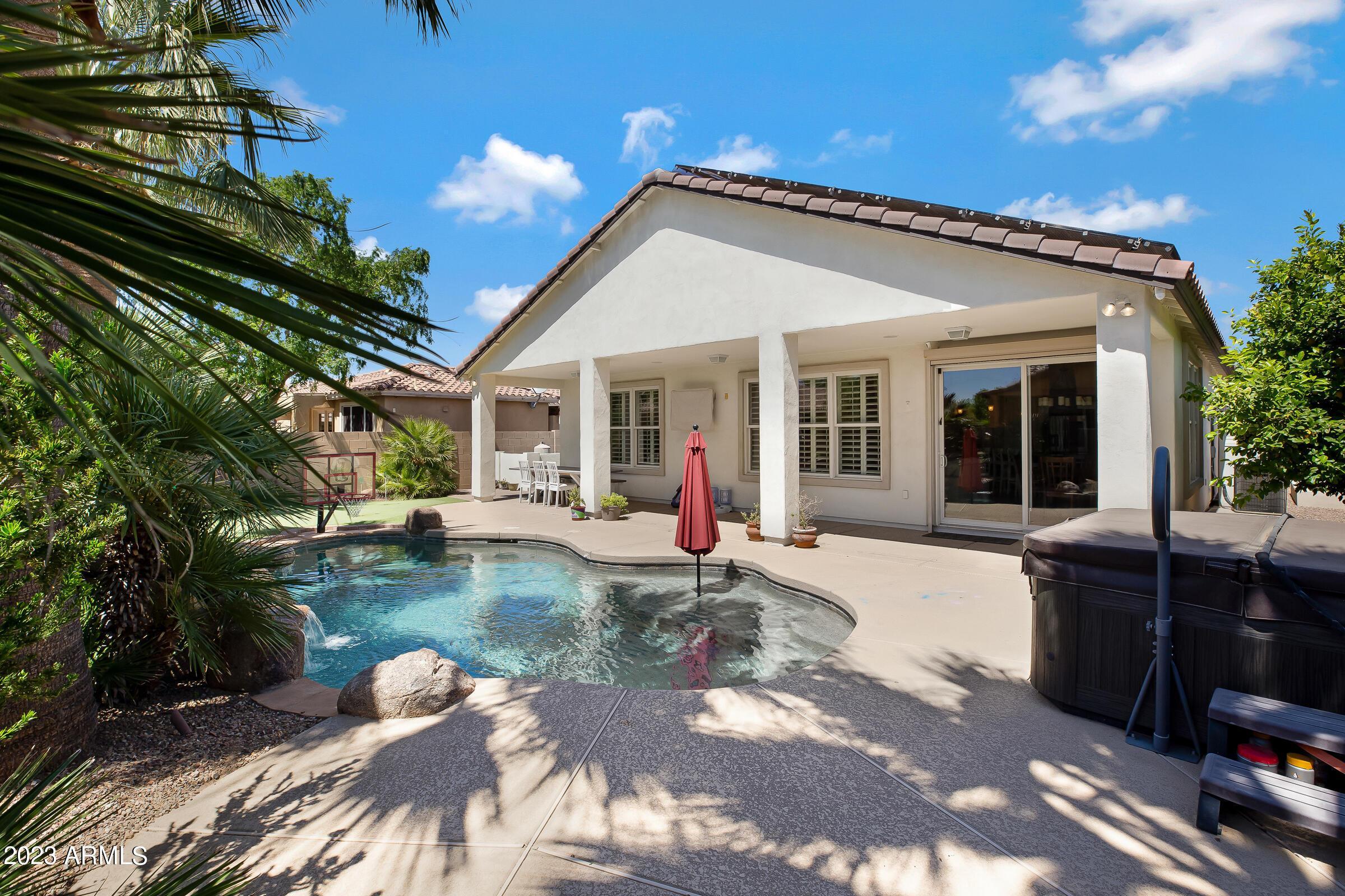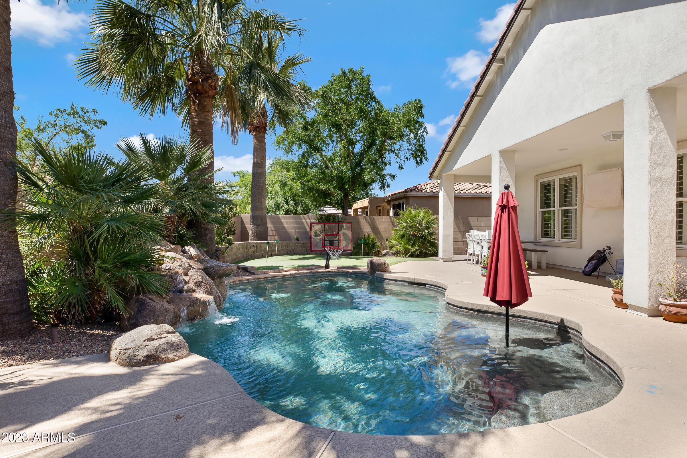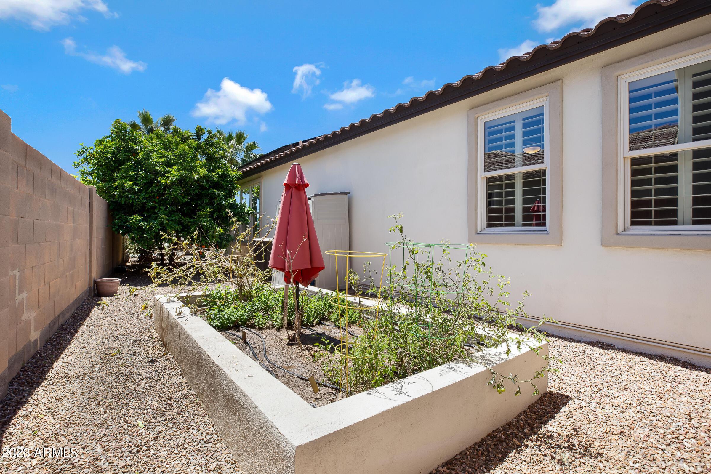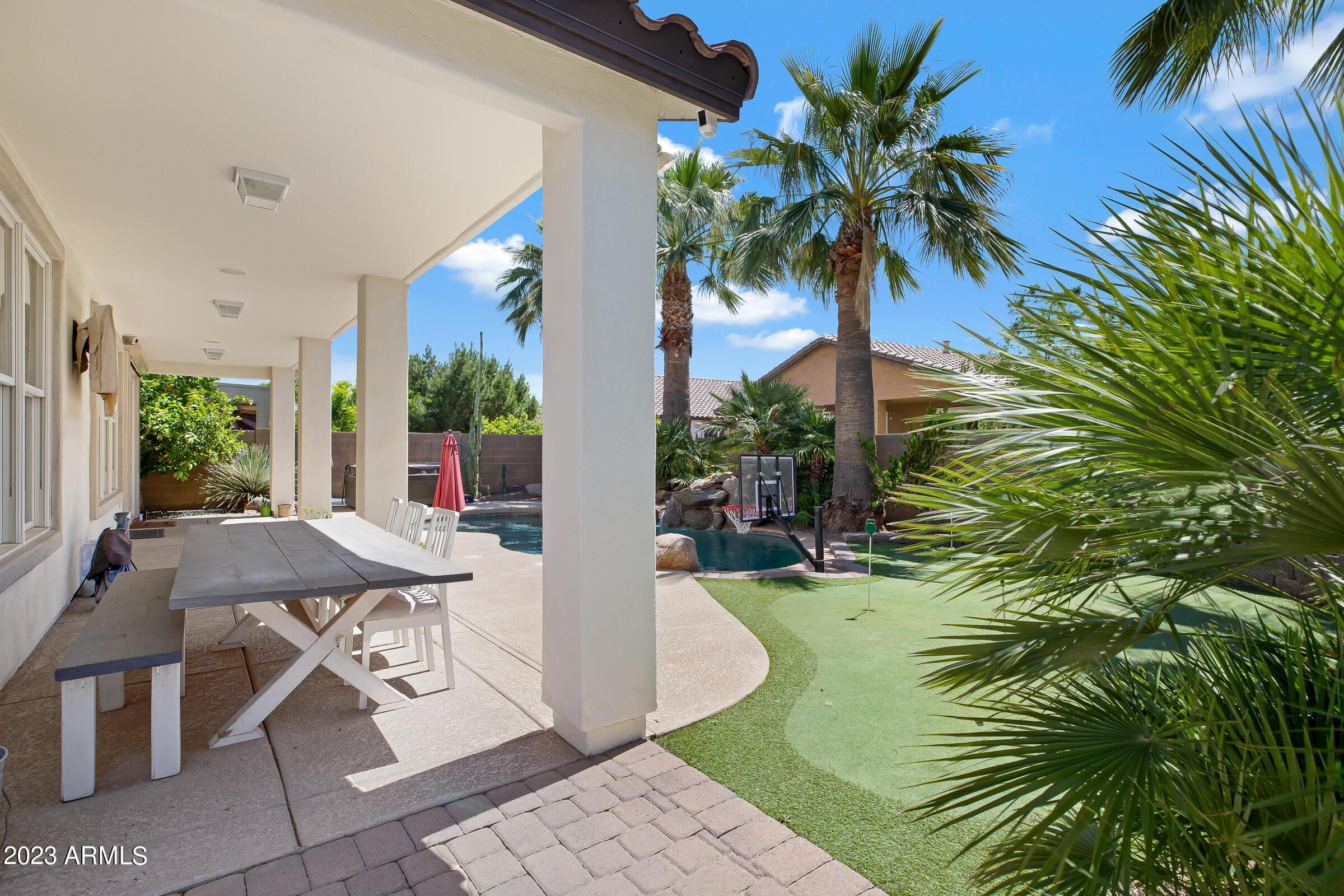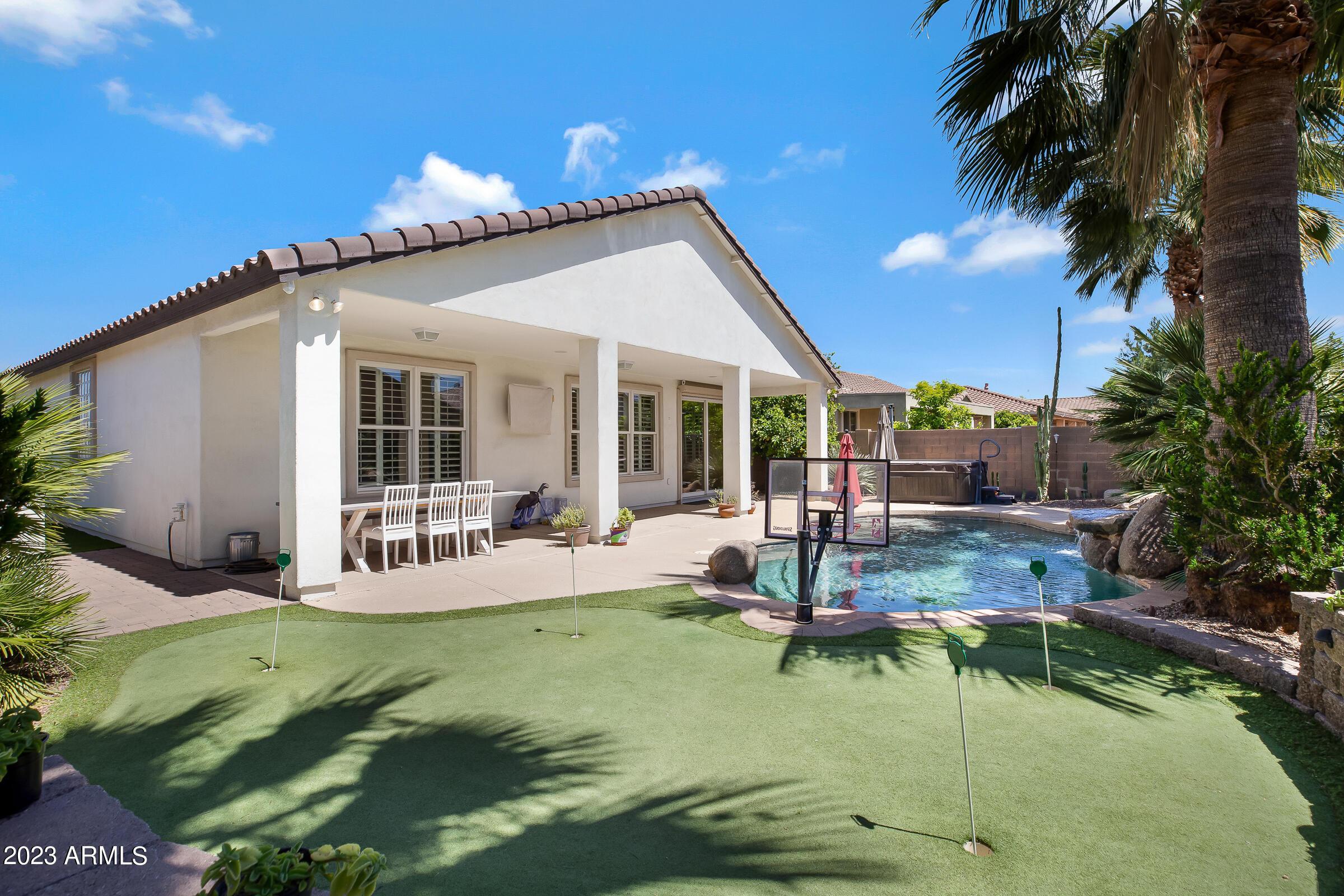 Amazing opportunity to rent this wonderful home that is available now!SAVE $$ with SOLAR! The backyard is an entertainers dream with heated pool, above ground spa, extended patio, putting green, palms, lemon & orange trees, raised irrigated vegetable and herb garden, large side yards with artificial turf and added storage. This immaculately kept home offers 3 spacious bedrooms w/ walk-in closets, plus a home office/den, separate living room & large great room w/ surround sound, vaulted ceilings, expansive kitchen w/ pantry, stainless appliances, commercial grade gas stove/ hood, granite counters, center island & tons of cabinets! Wood shutters & ceiling fans throughout. Prewired for Dish TV. Security System. Close to Loop 202, tons of shopping, dining, entertainment & Centennial Par