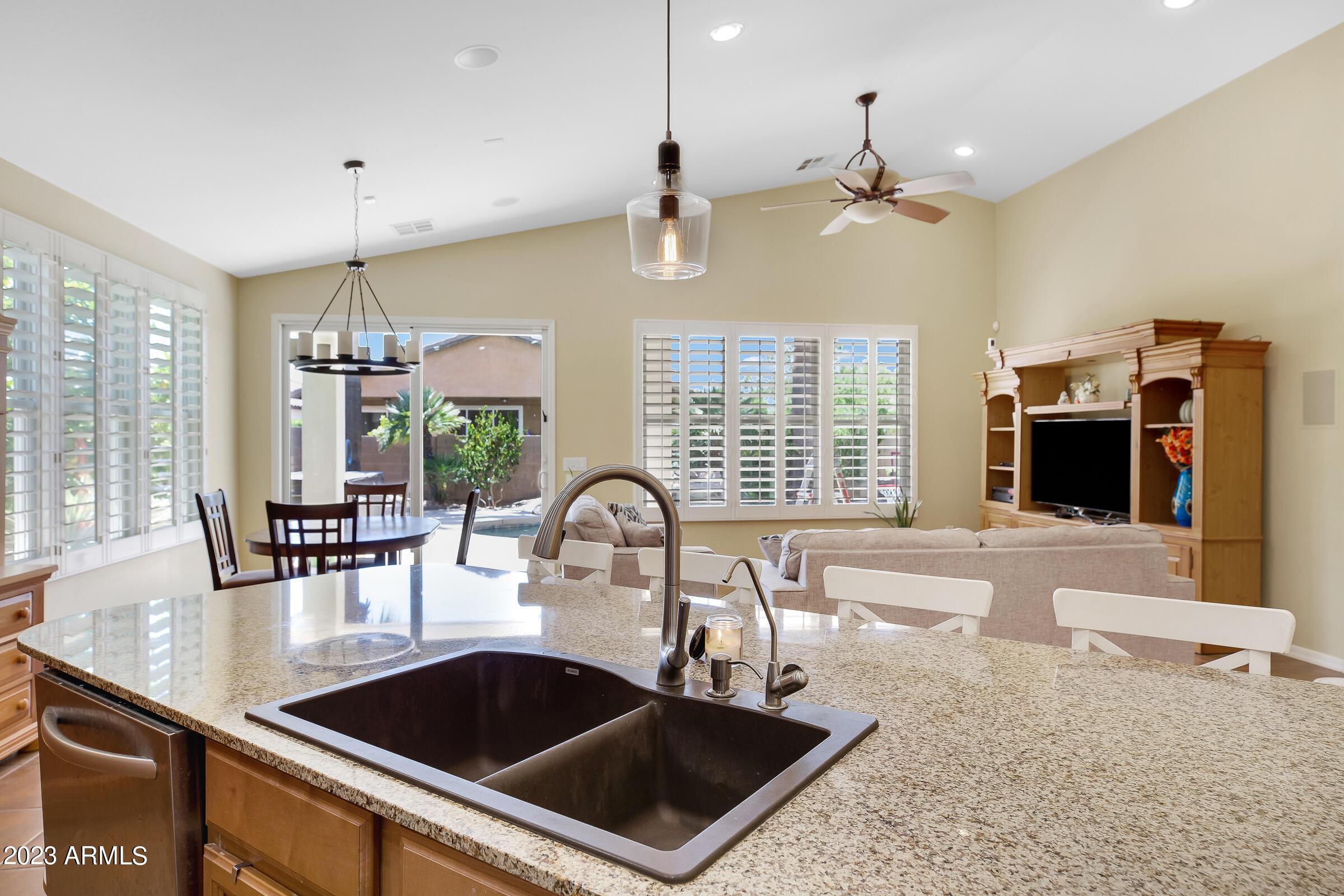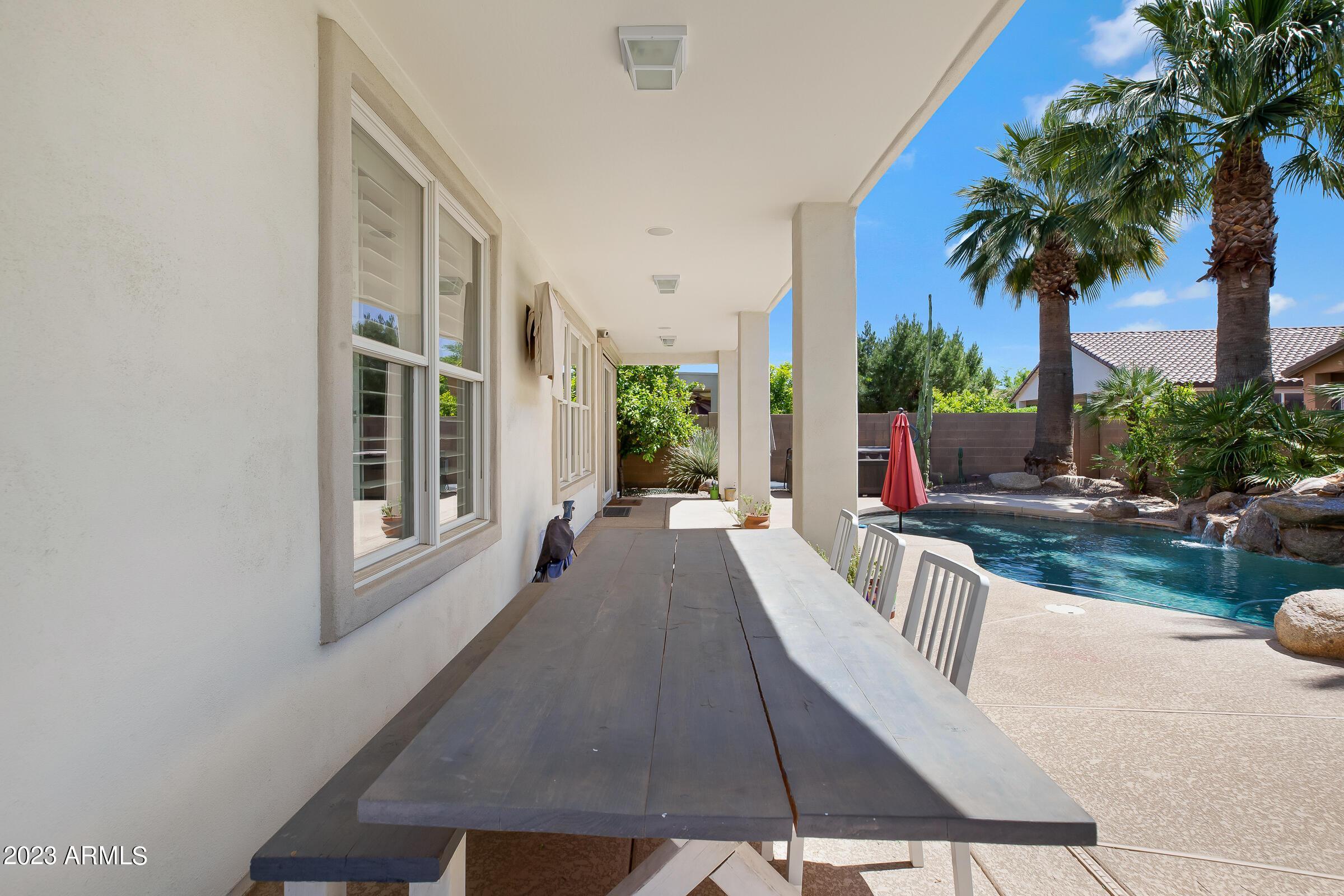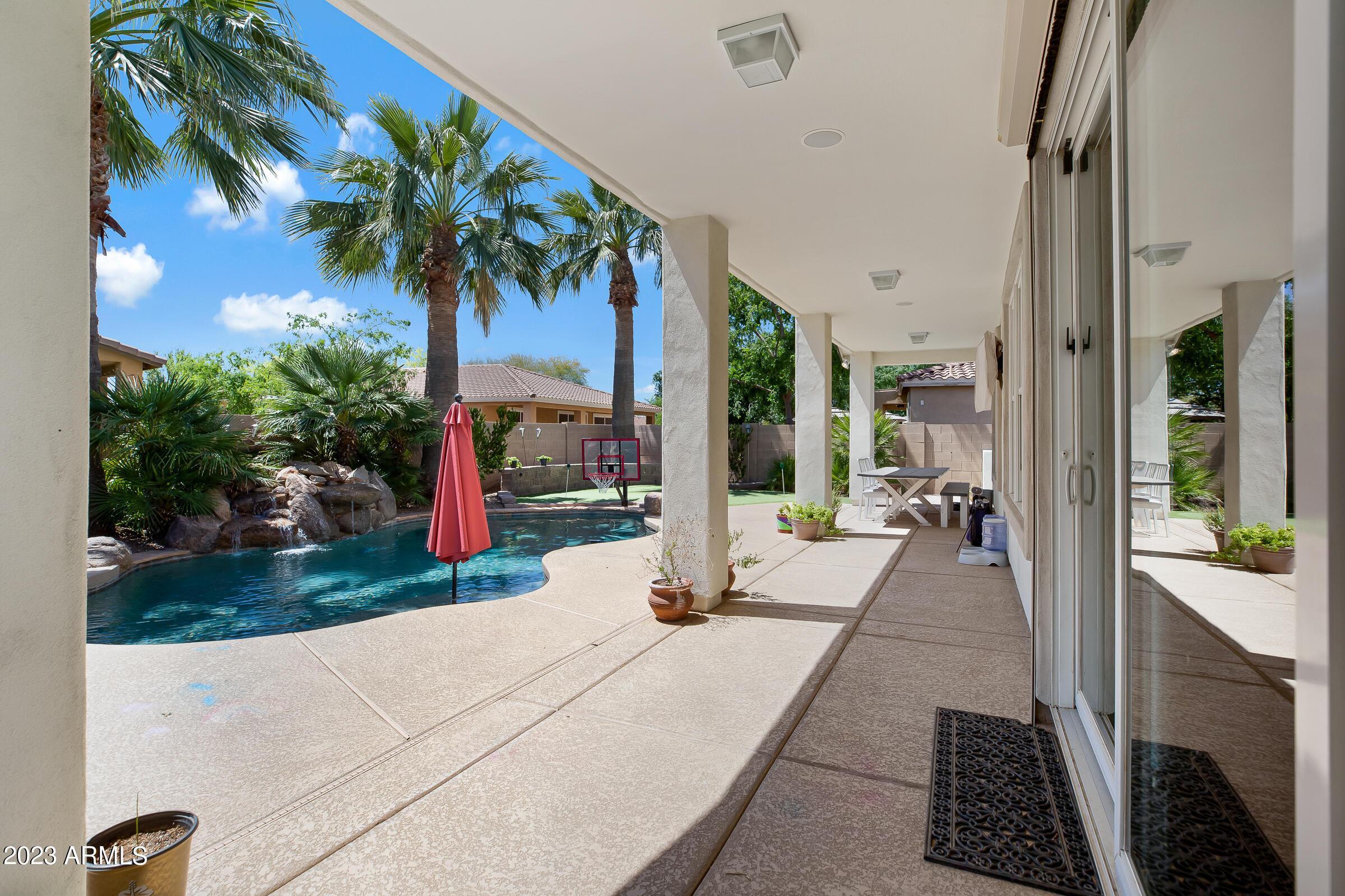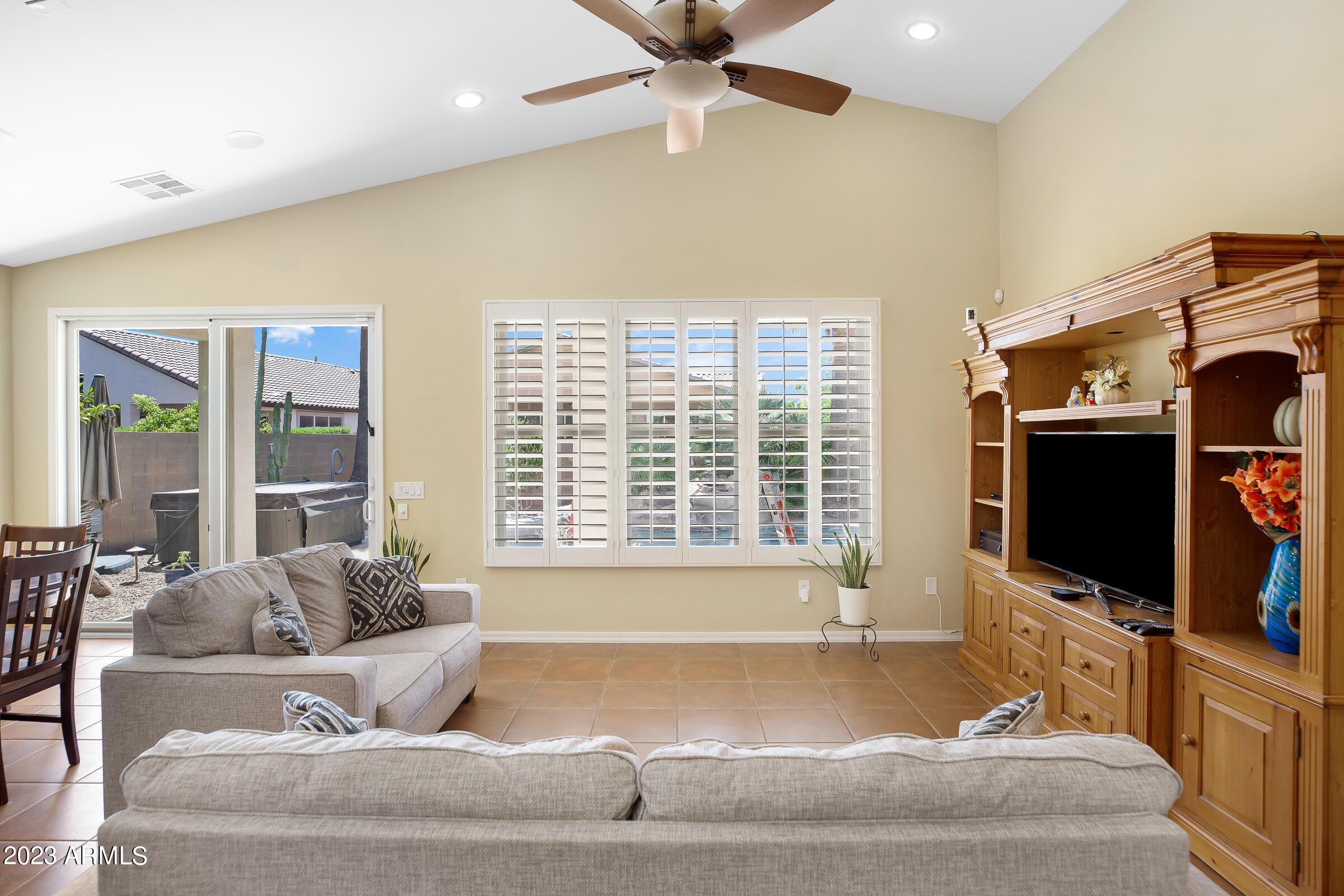 Amazing opportunity to rent this wonderful home that is available now!SAVE $$ with SOLAR! The backyard is an entertainers dream with heated pool, above ground spa, extended patio, putting green, palms, lemon & orange trees, raised irrigated vegetable and herb garden, large side yards with artificial turf and added storage. This immaculately kept home offers 3 spacious bedrooms w/ walk-in closets, plus a home office/den, separate living room & large great room w/ surround sound, vaulted ceilings, expansive kitchen w/ pantry, stainless appliances, commercial grade gas stove/ hood, granite counters, center island & tons of cabinets! Wood shutters & ceiling fans throughout. Prewired for Dish TV. Security System. Close to Loop 202, tons of shopping, dining, entertainment & Centennial Par